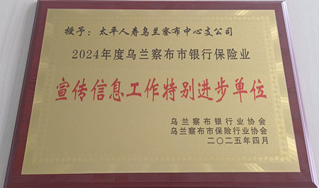 2025年4月乌兰察布市保险业协会、银行业协会联合发文,决定对2024年度乌兰察布市银行保险业宣传信息工作先进单位进行表彰,本次涵盖全市28家保险机构参评,其中寿险获奖单位5家。太平人寿保险有限公司乌兰察布中心支公司(以下简称“太平人寿乌兰察布中心支公司”)荣获2024 年度乌兰察布市银行保险业宣传信息工作特别进步单位称号。