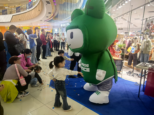 上午11时许,店门口已经聚集了不少家长和小朋友。绿色的气球拱门高高矗立,仿佛一道通往童话世界的大门,吸引着人们的目光。青蛙王子卡通人偶站在门前憨态可掬,小朋友们纷纷拉着家长上前合影留念,现场满是欢声笑语。“我家孩子从沐浴露到擦脸油乃至衣服,都是穿的青蛙王子品牌,很舒适,听说今天开业有活动,一大早就过来看看。”市民刘女士笑着说道。