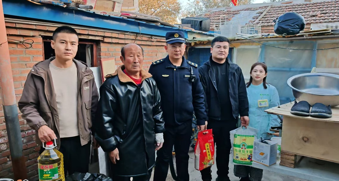 他们看望的第一位老人是一位患癌症已经5年的大爷,身体被病魔折磨得十分虚弱,但即便如此,为了给在读书的孩子凑齐学费和生活费,他不得不拖着病体,在大广场摆个小摊卖儿童玩具。那摊位在繁华的街道显得那么渺小和无助,那些色彩斑斓的玩具,在旁人眼中或许只是简单的商品,可对于大爷来说,却是他生活的全部支撑。每卖出一个玩具,他的脸上就会露出一丝欣慰的笑容,那笑容背后,藏着多少生活的艰辛和对孩子的期望。大家走进大爷昏暗的家中,屋内的陈设十分简陋,一张破旧的床、一张掉漆的桌子,就是全部的家当,大家把一袋袋米面和一桶桶食用油搬进屋里。靳鹏和孟林冲围在大爷身边,眼神中充满了关切。仔细询问大爷的身体状况,认真倾听大爷诉说着病痛的折磨;靳鹏拉着大爷的手,鼓励他要坚强,告诉大爷有困难要及时说出来,大家帮着解决。大爷看着眼前忙碌的身影,嘴唇动了动,却一时说不出话来,眼中闪烁着感动的泪花。