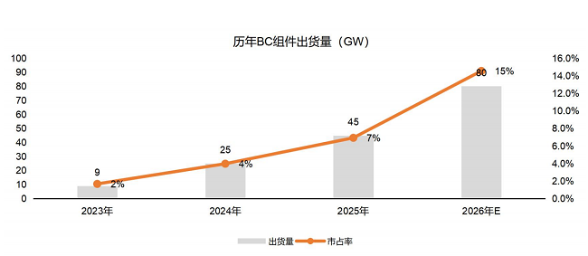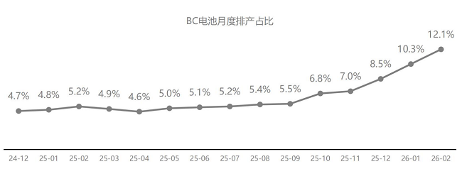 产能快速扩张:据不完全统计,截至2025年底,全球BC电池在建及落地产能已达88GW,月度平均产出约3.5GW、开工率约50%,在电池排产中占比约5.7%。进入2026年1-2月,BC电池月产出均超过4GW,开工率接近60%,在全行业电池排产中的占比从5.7%跃升至10-12%。在P型乃至大量TOPCon产线因产能过剩而停工减产、开工率低于30%的背景下,BC技术持续保持高开工率并逆势扩张,充分彰显了市场对高效产品的强烈需求。预计到2026年底,BC电池总产能或将增长至约150GW,产业规模效应全面显现。