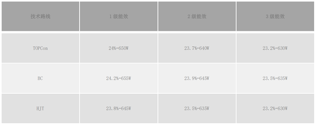 不同技术路线组件能耗等级转换效率要求(征求意见稿)