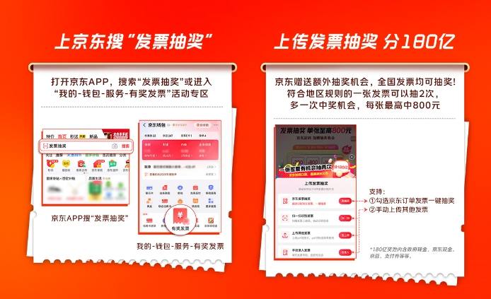 近期,京东还在国家有奖发票活动基础上额外加码。全国范围内,只要参与上传发票的用户,即可共同瓜分京东180亿奖池,奖励涵盖现金、京豆、支付券等多种形式,与各城市活动奖励叠加享受,让每一张发票的价值加倍放大。