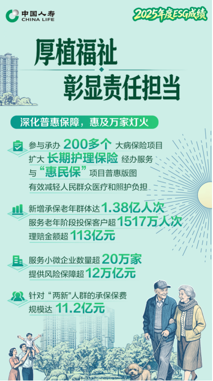 织密普惠保险保障网,为中国式现代化征程提供坚实守护。深度参与多层次社会保障体系建设,参与承办200多个大病保险项目,扩大长期护理保险经办服务与“惠民保”项目普惠版图,有效减轻人民群众医疗和照护负担。秉持长期主义视角,投资服务实体经济超5万亿元,以金融活水精准赋能经济循环转换。聚焦乡村振兴战略部署,累计研发专项产品20余款,惠及涉农人口超2亿人次;选派千余名帮扶干部扎根1085个帮扶点,以实干担当书写金融央企服务国计民生的责任答卷。此外,为切实提升金融服务可及性与普惠性,中国人寿持续深化对偏远地区的服务覆盖与金融知识普及工作。从世界屋脊的西藏阿里高原,到西南边陲的云南磨憨口岸;从祖国最北端的黑龙江北极村落,到漫长的边境一线,中国人寿的服务网点星罗棋布,以实际行动不断延伸服务触角,致力于将专业、温暖的保险服务送达每一位有需要的客户身边,全力打通保险服务“最后一公里”。同时,服务落地的成效在金融消费者教育领域得到显著体现,2025年“3·15”金融消费者权益保护教育宣传及金融教育宣传周活动期间,该公司开展的集中教育宣传活动有效触及消费者人次同比显著提升31.4%。特别是在金融教育宣传周活动中,其面向重点地区精准发力:在西藏地区开展普及13万人次,在新疆地区惠及350万人次,在青海地区覆盖65万人次,有力提升了当地民众的金融素养和风险防范意识。